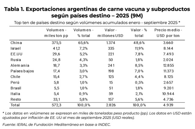 Entre enero y septiembre de 2025, las exportaciones argentinas de carne vacuna y subproductos (carne con o sin hueso, enfriada o congelada, menudencias y huesos del desposte) acumularon un total de 572 mil toneladas (peso producto) y USD 2.826 millones, un 11% menos volumen y 17% más valor que en el mismo período del año pasado, respectivamente.