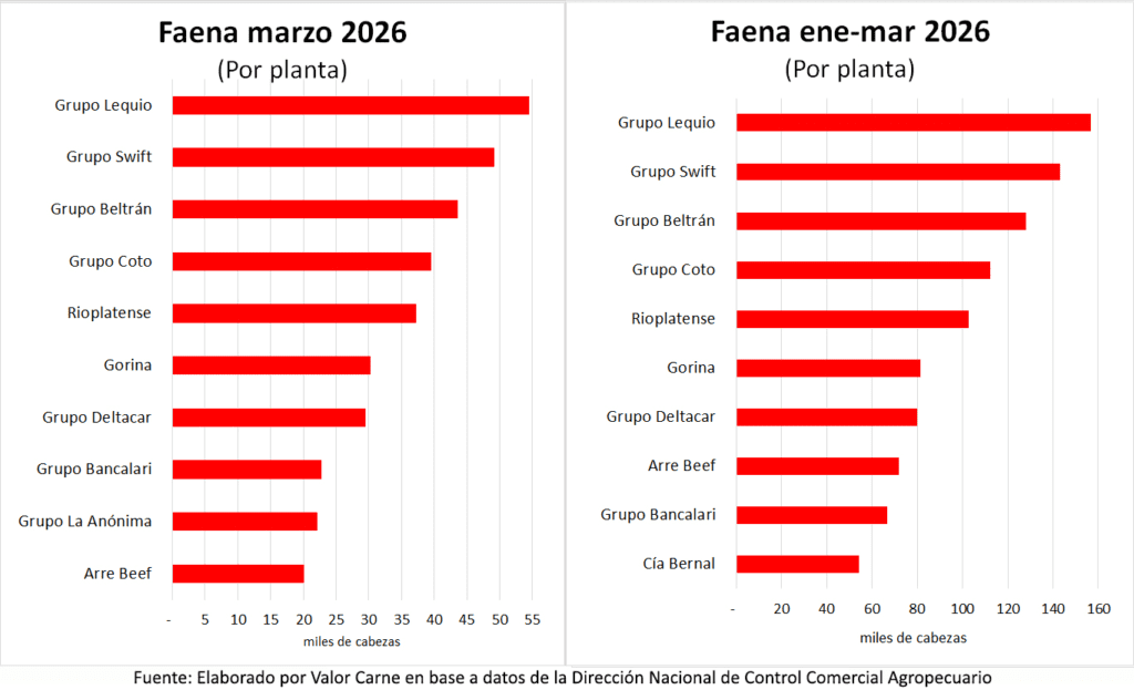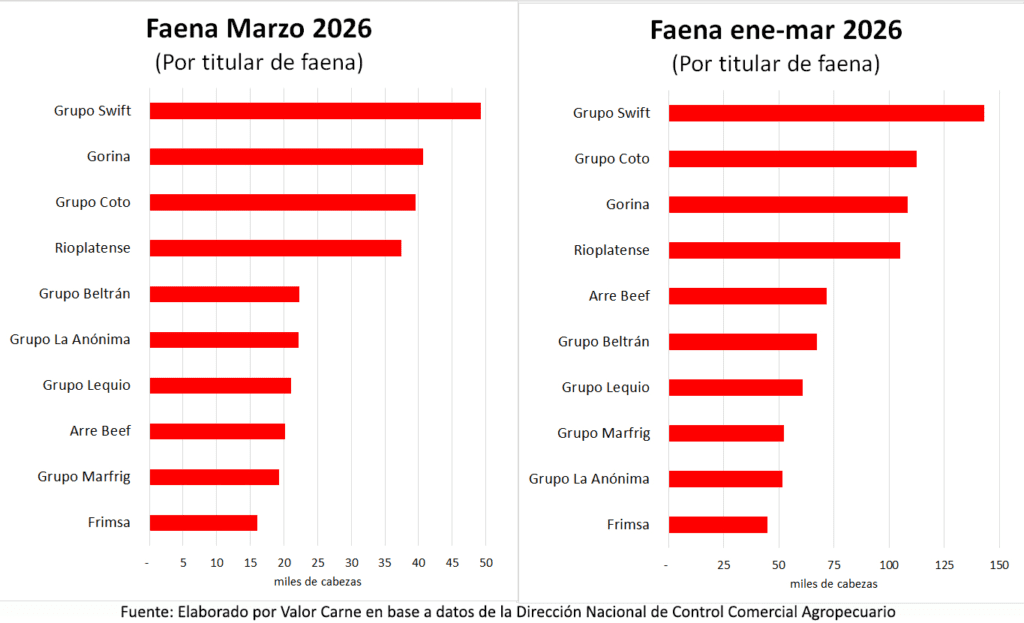 Las diez empresas o grupos líderes de la Argentina faenaron 349 mil cabezas en marzo, unas 41 mil más que en febrero, con una participación del 34% sobre el total nacional, un punto más que en el mes anterior.