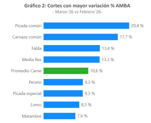 El incremento de la carne en marzo tiene que ver con las subas que se dieron en la hacienda desde inicios de febrero, aunque a mediados del mes pasado comenzaron a perder fuerza. Por otra parte, el traslado al consumidor da cuenta de la imposibilidad de que aquellos aumentos sean absorbidos por matarifes, frigoríficos y comerciantes, que se ven obligados a retocar el valor final.