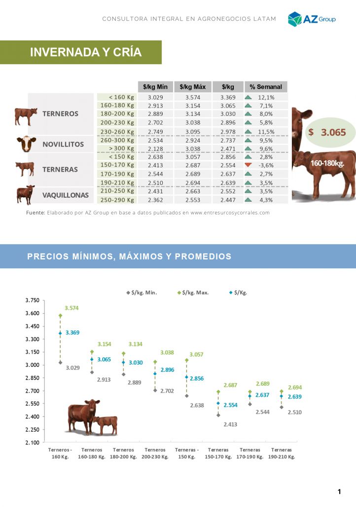 Esta semana promedió en $3.065/kg., un incremento de un +7,1% comparado con la semana anterior. Misma situación para el resto de la invernada. Los vientres también vienen en suba.