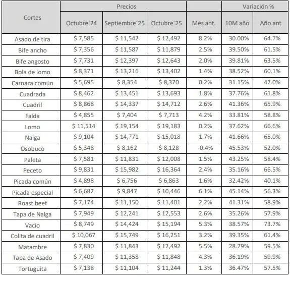 Por punto de venta existen diferencias durante el último mes de octubre 2025, los precios variaron un 3 por ciento, con respecto al mes anterior en las carnicerías y un 2,6 por ciento en supermercados. “Si se analiza el precio de la carne vacuna en las carnicerías el mismo exhibió alzas del 3 por ciento durante octubre y 64,8 por ciento con respecto al mismo mes del 2024. Por otro lado, el precio promedio de la carne vacuna en supermercado mostró una variación del 2,6 por ciento con respecto al mes anterior y 54,1 por ciento con respecto a octubre 2024”, dice el informe.
